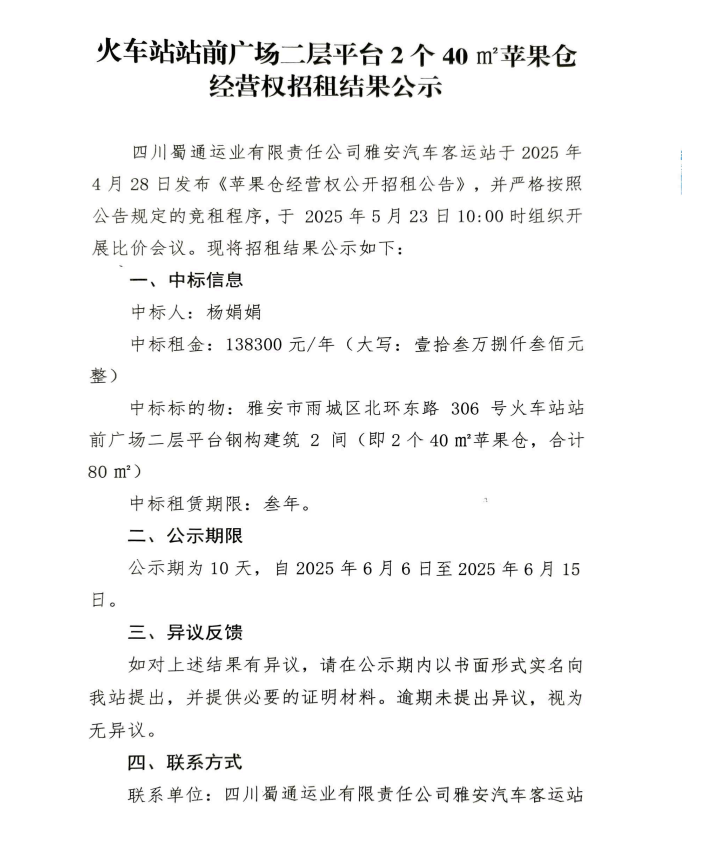 火車站站前廣場(chǎng)二層平臺(tái)2個(gè)40㎡蘋果倉經(jīng)營權(quán)招租結(jié)果公示