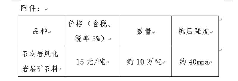 現(xiàn)將我公司礦山首采平臺的石灰?guī)r風(fēng)化巖層礦石料定價(jià)出售事宜進(jìn)行公示(見附件),經(jīng)公司研究決定,定價(jià)出售風(fēng)化巖層礦石料約10萬噸,現(xiàn)通過集團(tuán)公司官網(wǎng)信息公示后對外銷售。報(bào)名客戶數(shù)不限,銷售方式為先款后貨,簽約銷售,銷售時(shí)間以礦山開采和生產(chǎn)計(jì)劃為準(zhǔn)。