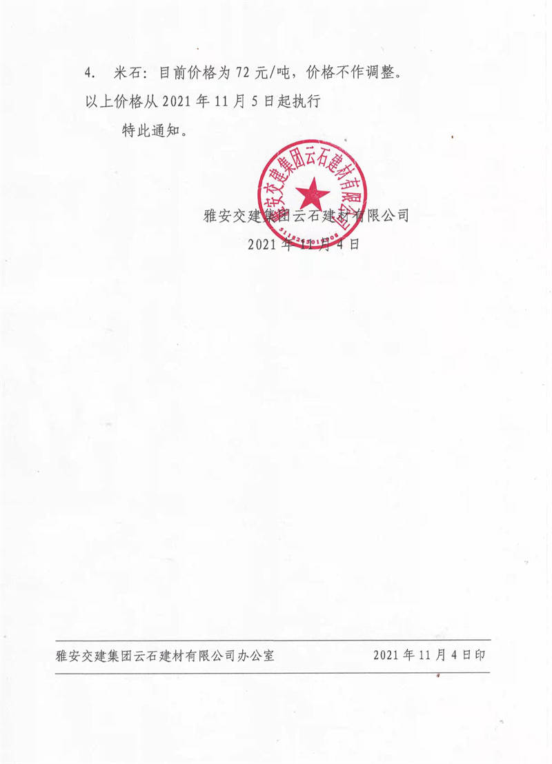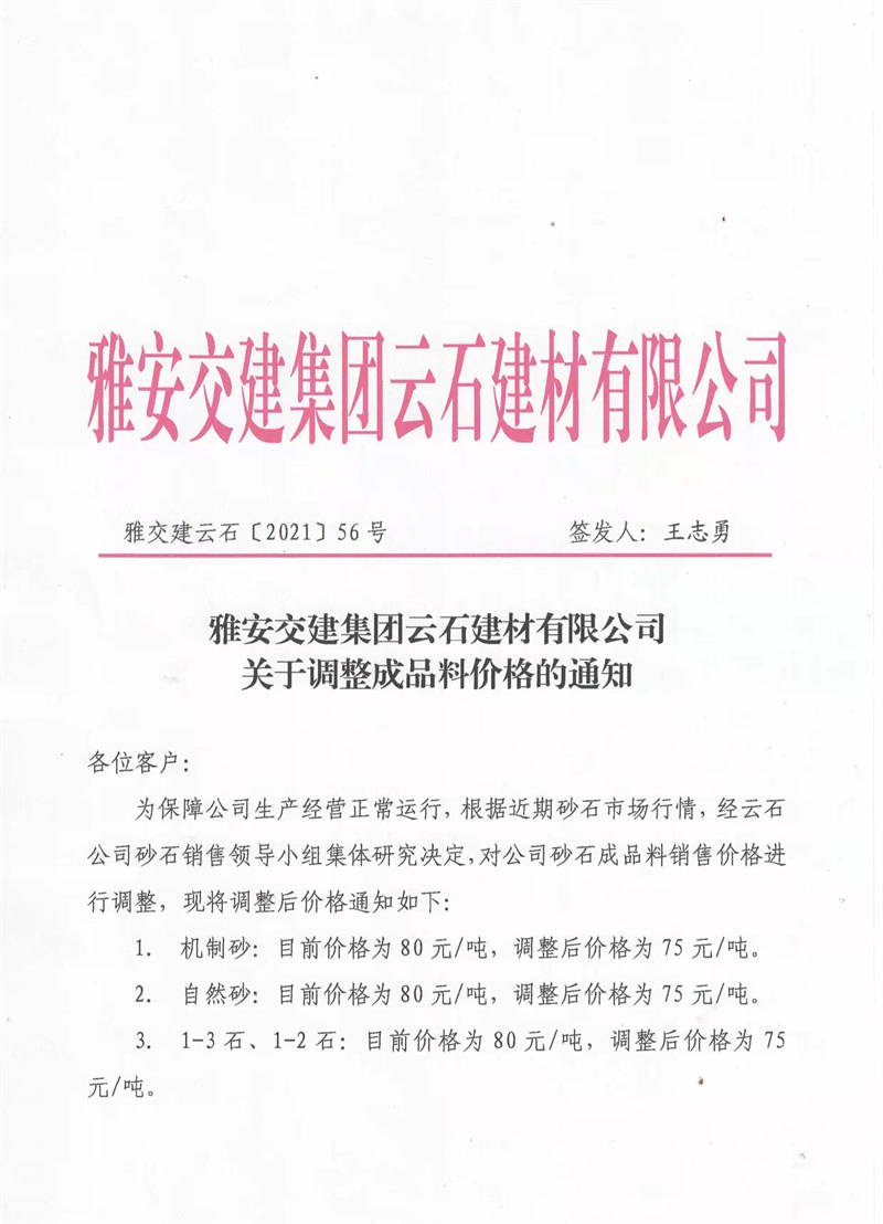 雅安交建集團(tuán)云石公司關(guān)于調(diào)整成品料銷售價(jià)格的通知(2021.11.4)