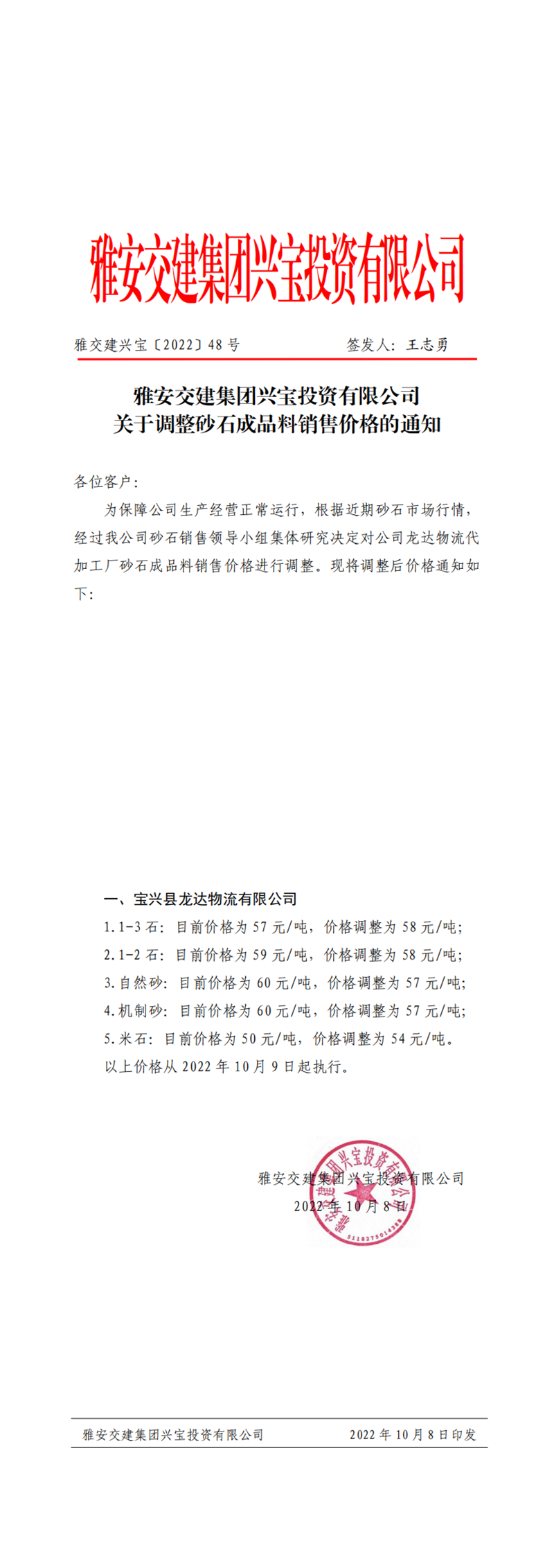 雅交建興寶〔2022〕48號 關于調整砂石成品料銷售價格的通知10.8