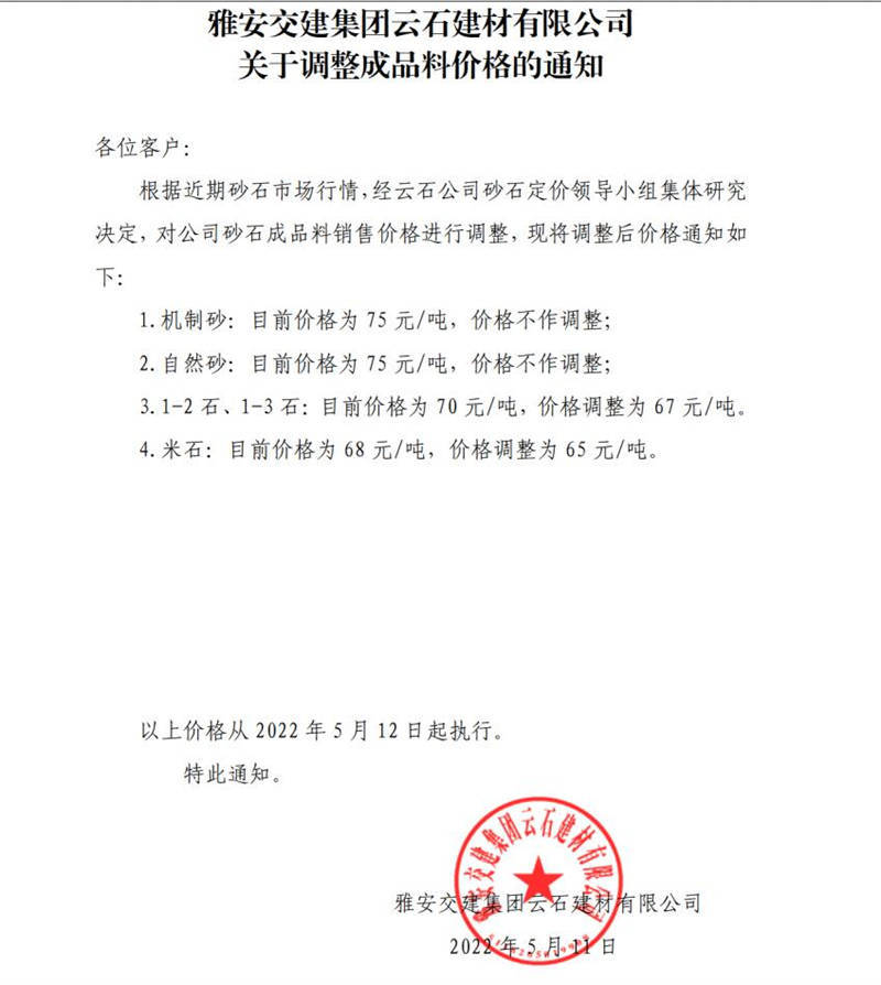 雅安交建云石建材有限公司調(diào)價通知-2022-5-12