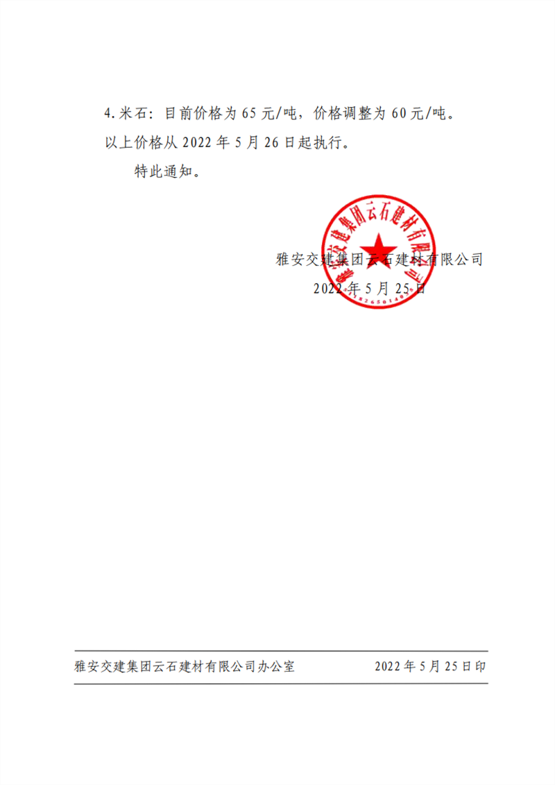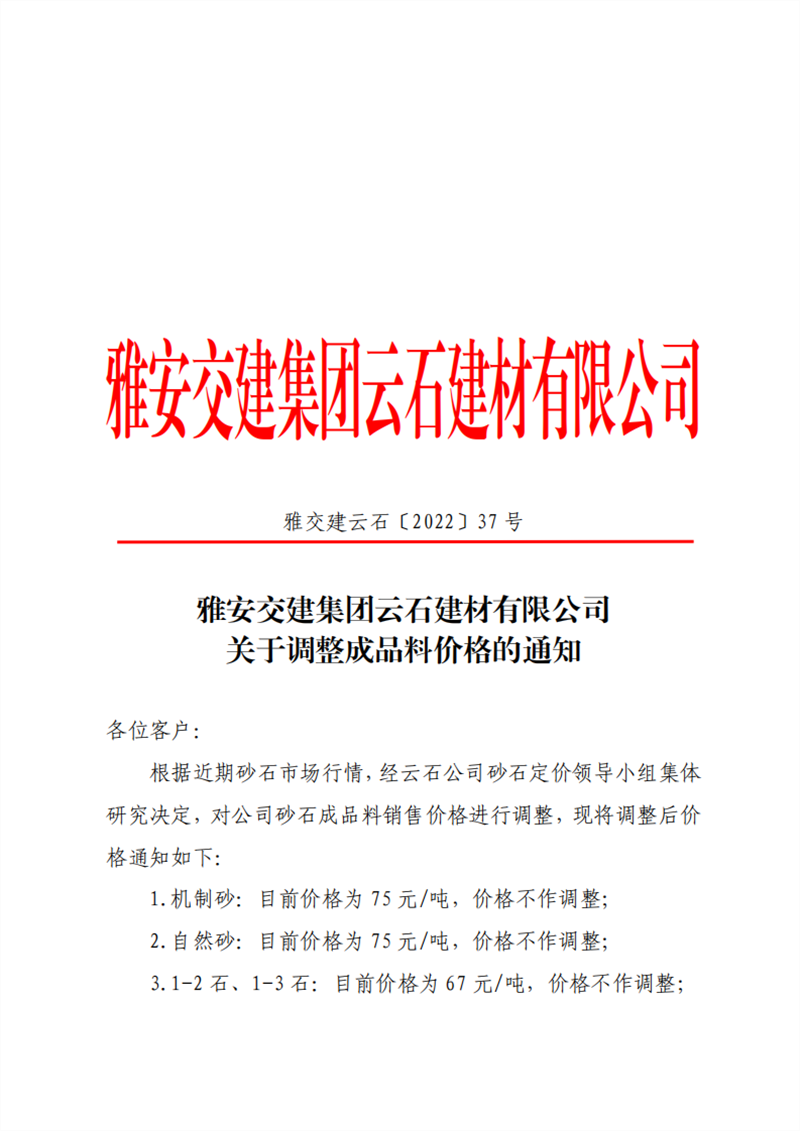 雅安交建集團(tuán)云石建材有限公司 關(guān)于調(diào)整成品料價(jià)格的通知--2022-5-25