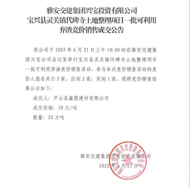 雅安交建集團(tuán)興寶投資有限公司寶興縣靈關(guān)鎮(zhèn)代碑寺土地整理項(xiàng)目-批可利用 棄渣競(jìng)價(jià)銷售公告( 2022.6.21)