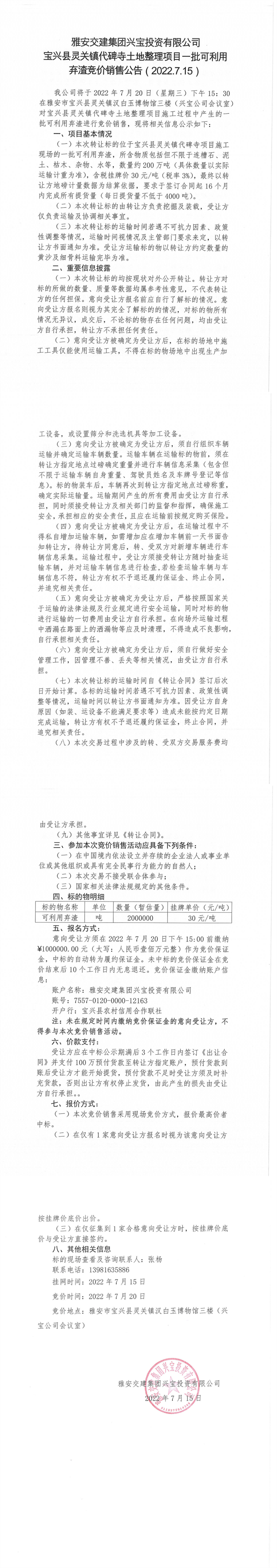 寶興縣靈關(guān)鎮(zhèn)代碑寺土地整理項(xiàng)目一批可利用棄渣競價(jià)銷售公告7.15(10萬噸)