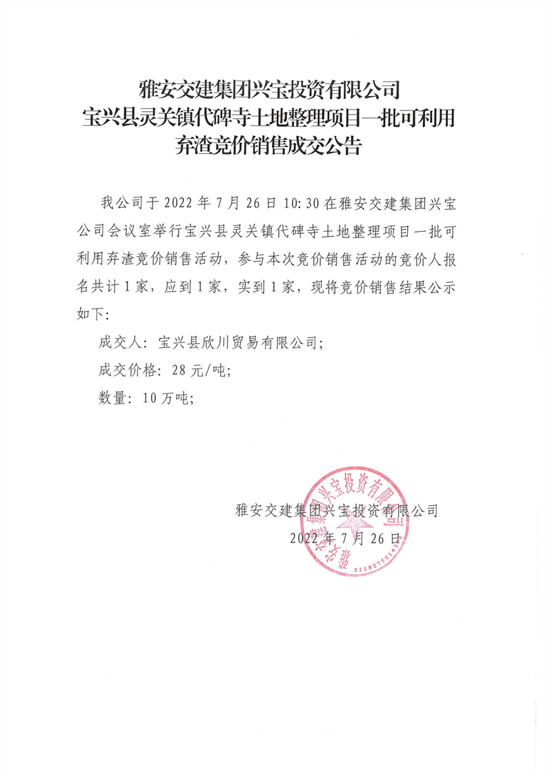 寶興縣靈關(guān)鎮(zhèn)代碑寺土地整理項(xiàng)目一批可利用棄渣競價(jià)銷售成交公告7.26(5萬噸)