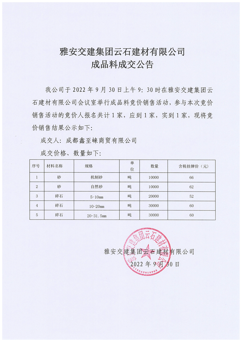 雅安交建集團(tuán)云石建材有限公司成品料成交公告9.30