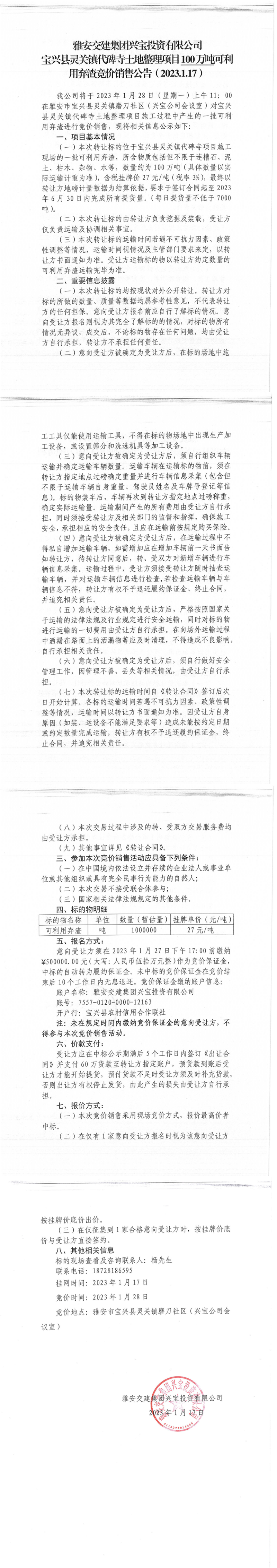 雅安交建集團興寶投資有限公司靈關(guān)鎮(zhèn)代碑寺土地整理項目100萬噸可利用棄渣競價銷售公告(2023.1.17)