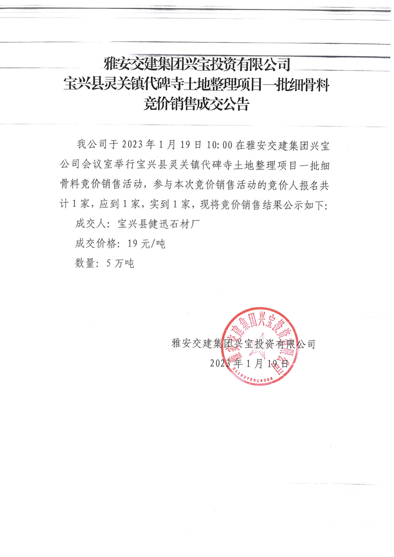雅安交建集團(tuán)興寶投資有限公司代碑寺土地整理項(xiàng)目細(xì)骨料競(jìng)價(jià)銷(xiāo)售成交公告(2023.1.19)