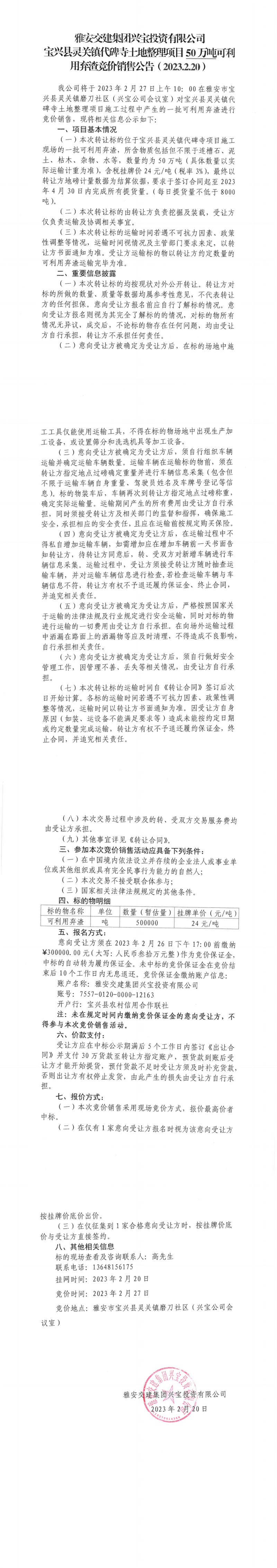 雅安交建集團(tuán)興寶投資有限公司靈關(guān)鎮(zhèn)代碑寺土地整理項(xiàng)目50萬噸可利用棄渣競價銷售公告(2023.2.20)、