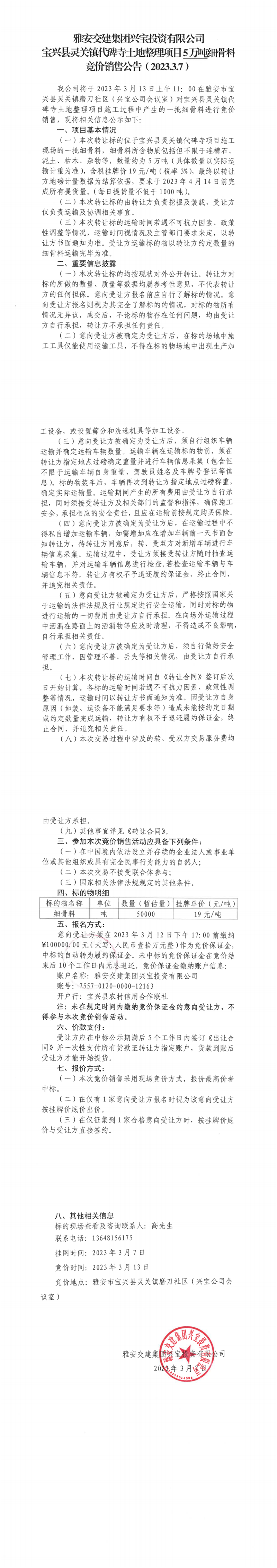 雅安交建集團(tuán)興寶投資有限公司寶興縣靈關(guān)鎮(zhèn)代碑寺土地整理項(xiàng)目5萬(wàn)噸細(xì)骨料競(jìng)價(jià)銷(xiāo)售公告(2023.3.7)
