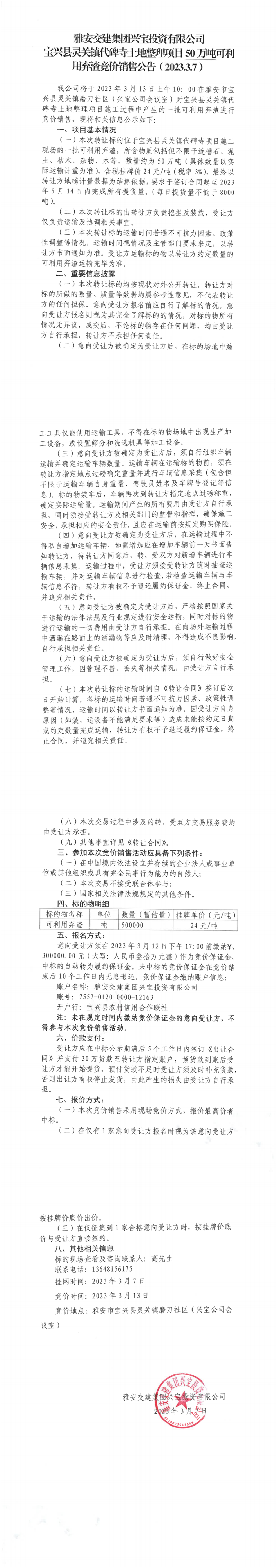 雅安交建集團興寶投資有限公司靈關鎮(zhèn)代碑寺土地整理項目50萬噸可利用棄渣競價銷售公告(2023.3.7)