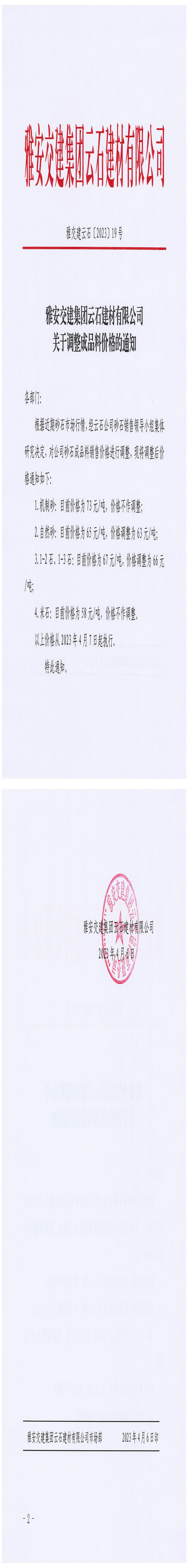 雅安交建集團云石建材有限公司關(guān)于調(diào)整成品料價格的通知(2023-4-6)