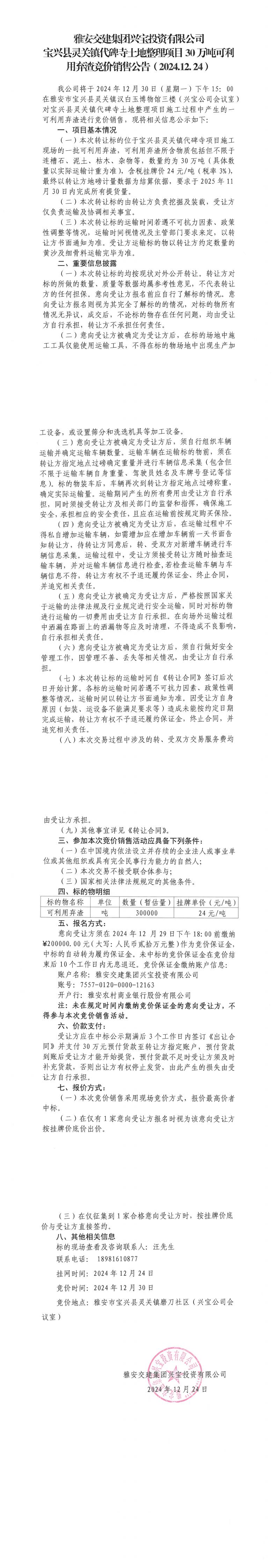 雅安交建集團(tuán)興寶投資有限公司靈關(guān)鎮(zhèn)代碑寺土地整理項(xiàng)目10萬(wàn)噸可利用棄渣競(jìng)價(jià)銷售公告(2024.12.24)