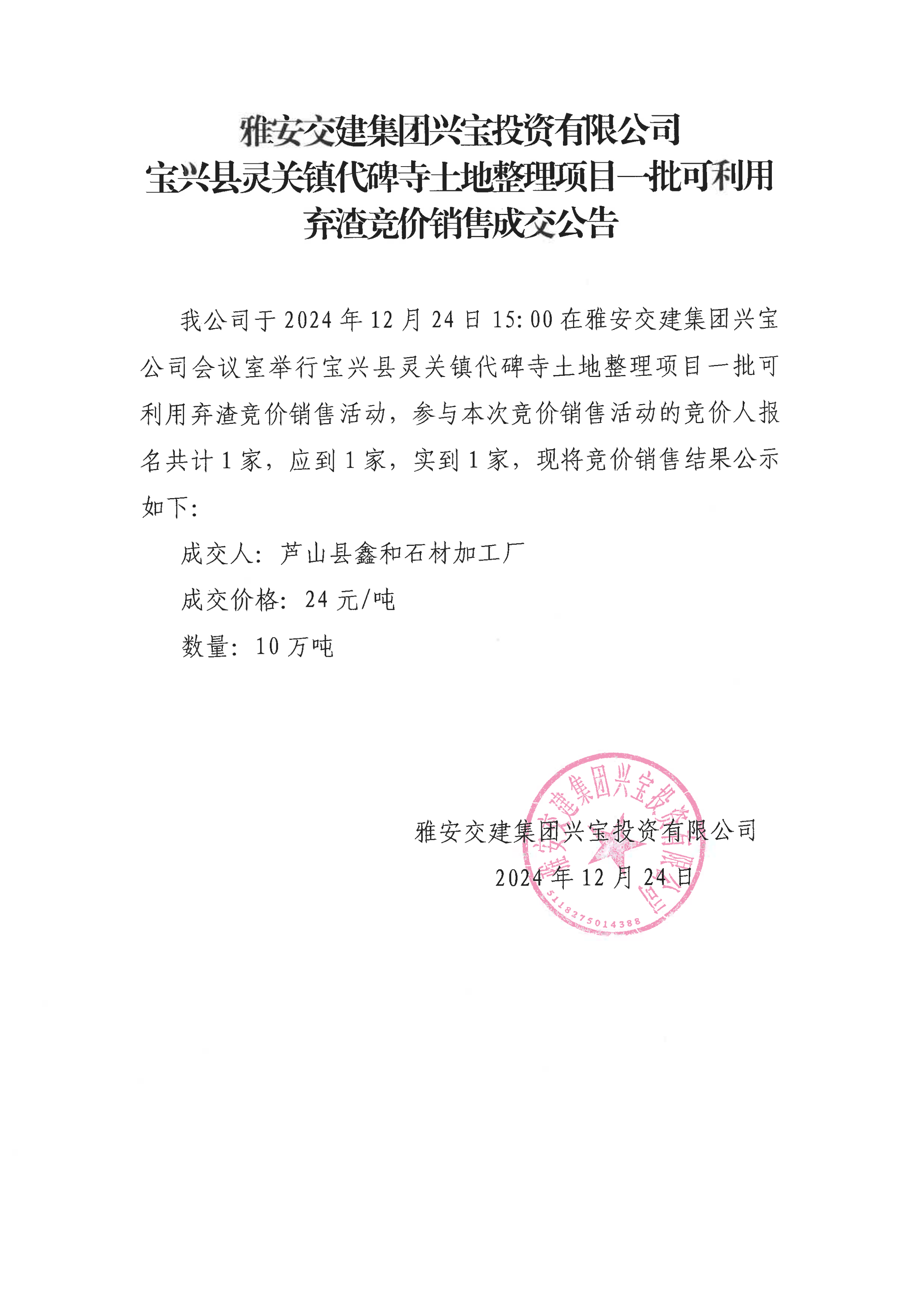 雅安交建集團興寶投資有限公司靈關(guān)鎮(zhèn)代碑寺土地整理項目10萬噸可利用棄渣成交公告(2024.12.24)