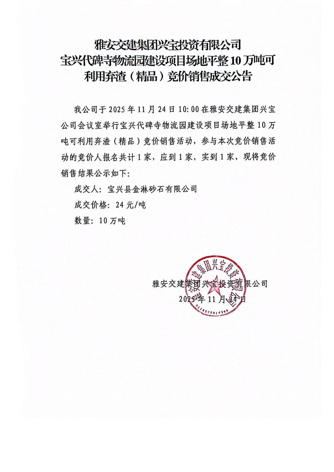 雅安交建集團(tuán)興寶投資有限公司10萬噸可利用棄渣(精品)競價銷售成交公告(2025.11.24)